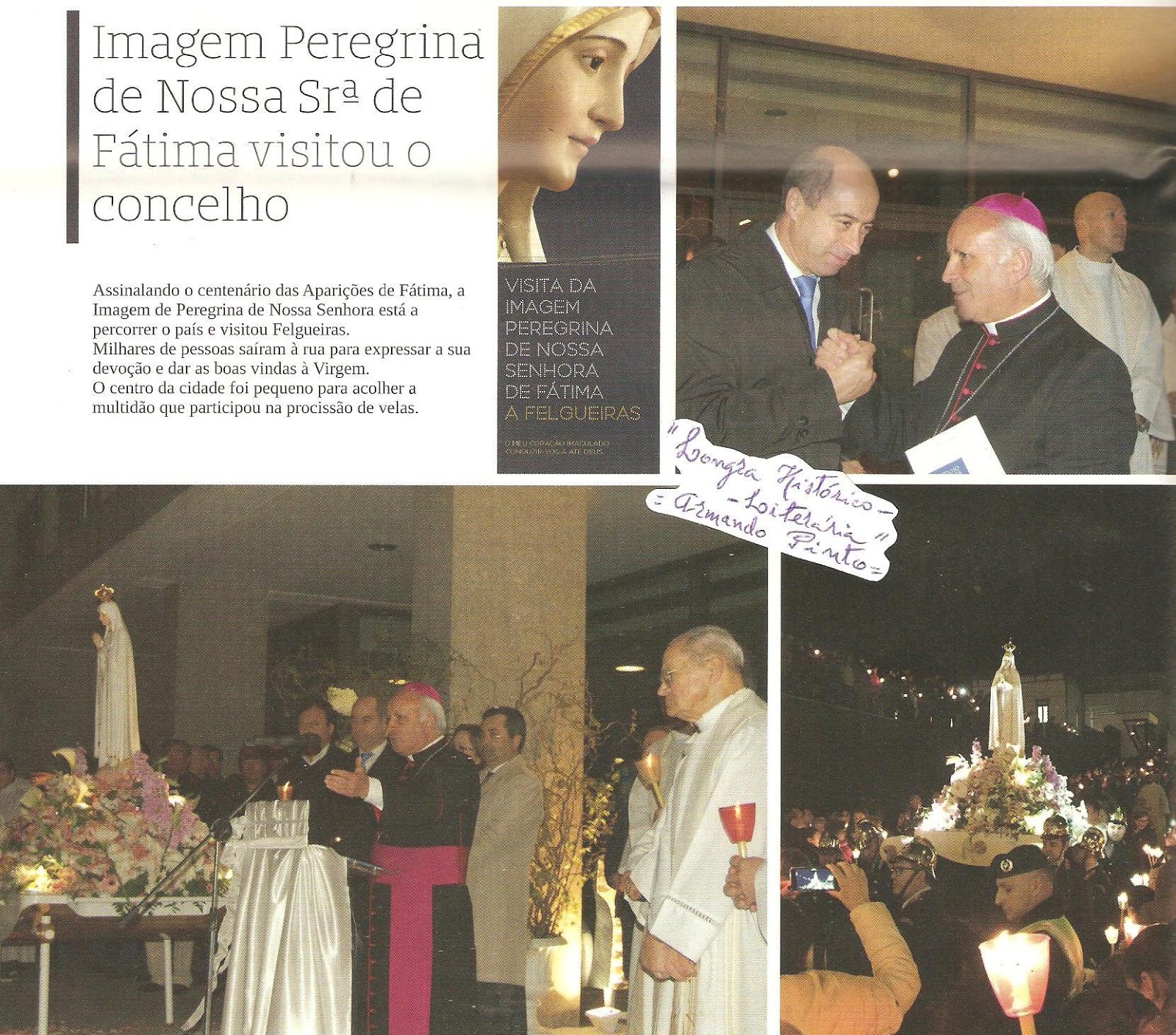 De permeio, rebobinando figuras retidas na sensibilidade comum, da anterior ocorrência marcante como foi a volta da imagem peregrina de Nossa Senhora de Fátima, perante a presença de D. António Francisco dos Santos em Felgueiras, como penhor seguro do significado que ficou a ter no povo felgueirense, juntamos imagens de reportagem alusiva que foi então publicada no jornal Voz Portucalense e um pequeno apontamento registado no Boletim Municipal “Felgueiras + Informa”.
